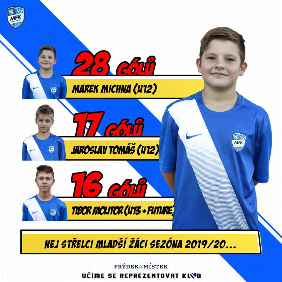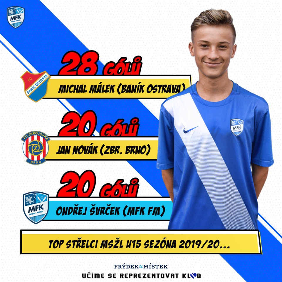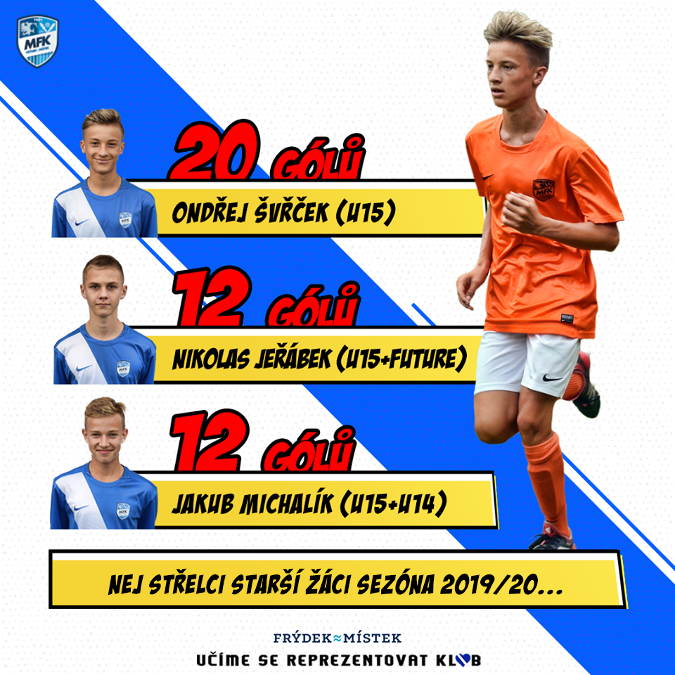 V podstatě můžeme hned navázat. Ve starších žácích to nejlépe pálilo právě Ondrovi Švrčkovi z U15. Dvacet gólů bylo suverénně nejvíce v rámci klubu, stačilo pak na třetí místo v tabulce střelců Moravskoslezské žákovské ligy. Na sedm gólů v jednom utkání do sítě Karviné se jen tak nezapomene. V mladších žácích si stejně suverénně počínal Marek Michna z U13, 28 vstřelených branek mluví za vše.