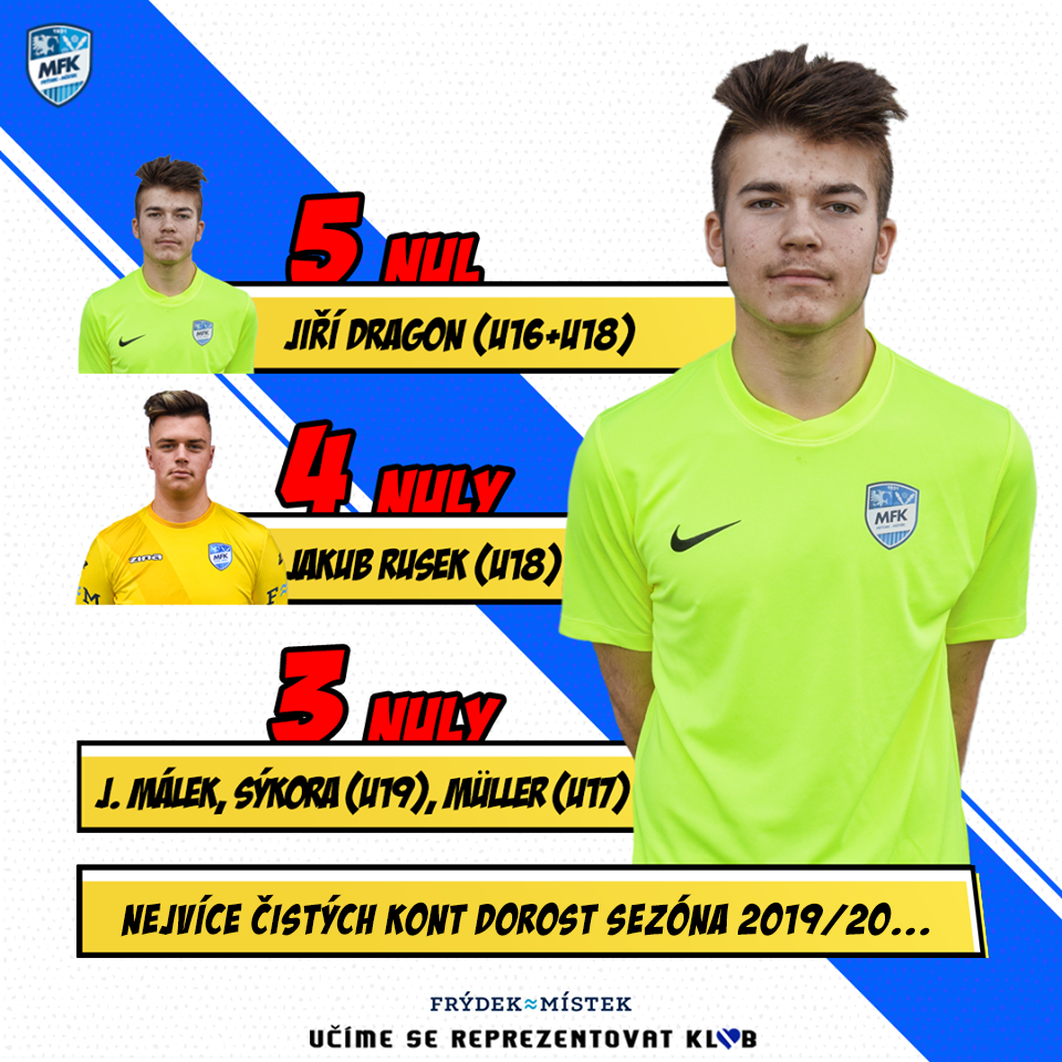 Statistiku čistých kont jsme sledovali převážně v dorosteneckých kategoriích. Ovládl ji nakonec brankář U16 Jirka Dragon s pěti čistými konty, jedno z nich si připsal za U18. S vychytanými nulami to mají brankáři v obou žákovských kategoriích složité, padá v nich totiž většinou více branek, zvláště pak v kategorii mladších žáků. Přesto i zde se několik čistých kont urodilo. Nejvíce si jich připsal v kategorii starších žáků Patrik Dudek, všechny tři nuly nasbíral za Future U15. V nejvyšší žákovské lize se o dvě čistá konta podělili Ondra Pohludka a Radim Řeha, ten navíc přidal i jeden čistý štít za Future U15. Šimon Šimeček si připsal jednu nulu v nejvyšší žákovské lize U14, Lukáš Strack pak také jednu v Krajské soutěži za Future U15. V mladších žácích se čistá konta sbírala ve Future U13, o pět čistých kont se podělilo hned pět brankářů – Strmiska, Rodek, Pastrňák, Rára a Kaňák.