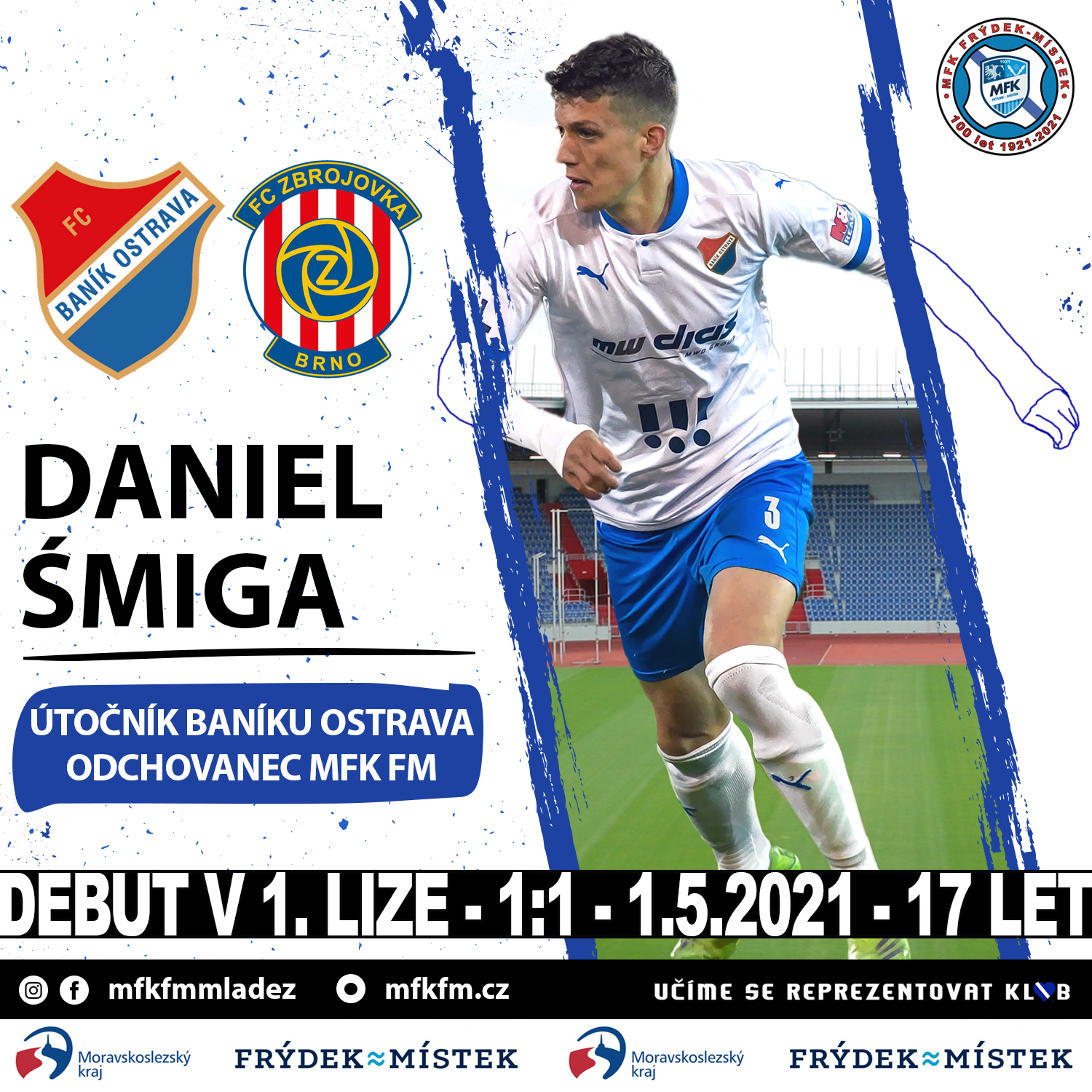 Jak bylo zmíněno, Daniel Šmiga v mládežnickém věku působil několik let v dresu MFK Frýdek-Místek, kde naši mládežničtí trenéři rozvíjeli jeho talent. A již tehdy byl rozhodně vidět. Není tak divu, že jeho výkony zaujaly Baník Ostrava. V roce 2017 právě tam přestoupil a jeho fotbalová hvězda nadále stoupala. V A-týmu Baníku už první minuty posbíral na konci minulého roku v přípravném utkání proti druholigové Líšní, na "ostrou" premiéru si ale musel počkat do prvního májového dne roku 2021. Do zápasu se Zbrojovkou naskakoval v závěru za stavu 1:1 a nebýt centimetrů, kdoví, mohl rozhodnout a zároveň se dočkat i prvního gólu v baníkovském áčku. „Měl jsem nastavené, že se pokusím na hřišti něco vytvořit pro tým. Dostal jsem se i do šance, ale bohužel se pískal ofsajd. Naštěstí jsem nic nezkazil, takže to nejhorší nebylo,“ vyprávěl talentovaný mladík po utkání v rozhovoru pro klubový web Baníku Ostrava. Kompletní dojmy bývalého Valcíře si můžete poslechnout ve videu níže. Co dodat závěrem? Snad jen to, že máme pocit, který nám našeptává, že ani na zmíněný první gól nebudeme v podaní Daniela čekat dlouho. Tak hodně štěstí Dane!