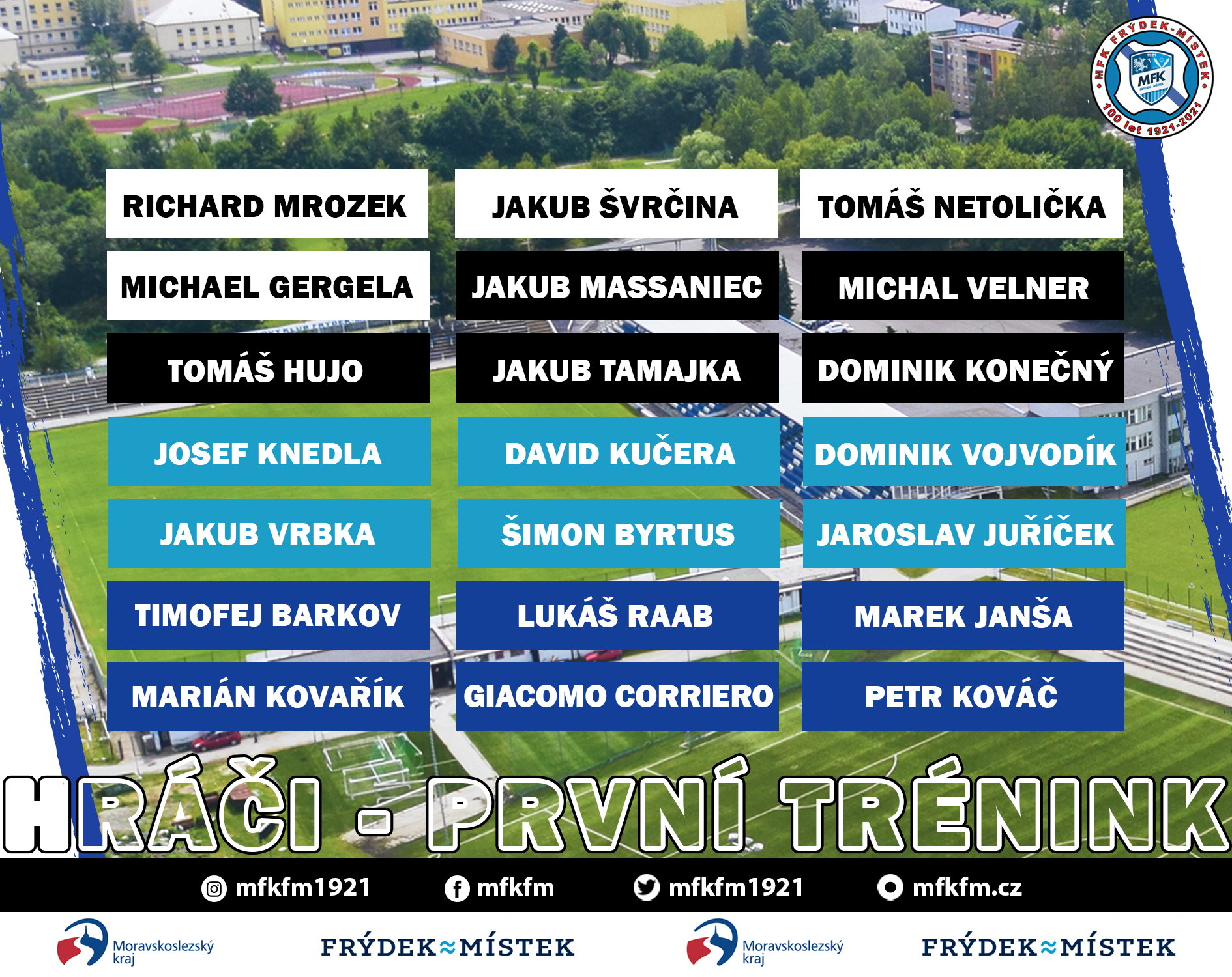 KÁDR NA PRVNÍM TRÉNINKU 17. KVĚTNA: Jakub Švrčina (Bohumín), Richard Mrozek (D. Datyně), Tomáš Netolička (MFK Vítkovice), Michael Gergela (Baník Ostrava) - Michal Velner (Baník Ostrava), Jaroslav Juříček (Frýdlant nad Ostravicí), Marián Kovařík (Vsetín), David Kučera (Frýdlant nad Ostravicí), Lukáš Raab (Baník Ostrava), Dominik Vojvodík (Lískovec), Jakub Tamajka (Baník Ostrava), Timofej Barkov (Baník Ostrava), Josef Knedla (Baník Ostrava), Dominik Konečný (Baník Ostrava), Jakub Vrbka (Baník Ostrava), Šimon Byrtus (Karviná), Tomáš Hujo (Karviná), Jakub Massaniec (Hlučín), Petr Kováč, Giacomo Corriero, Marek Janša (Uherský Brod).