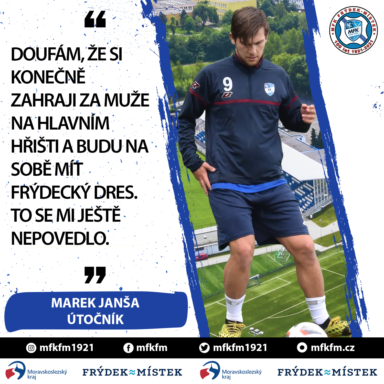 MAREK JANŠA - Marek začínal s fotbalem ve Fryčovicích, odkud jeho kroky vedly do Frýdku-Místku. Zde si jeho umu všimli v dorosteneckém věku v Sigmě Olomouc, kde půl roku hostoval. Posléze však zakotvil jinde, přestoupil z Frýdku-Místku do Slovácka. Talentovaný útočník zde naplňoval svůj potenciál, patřil mezi elitní dorostenecké střelce, jeho další vzestup však bohužel zastavila vážná nemoc. Aktuálně dvaadvacetiletý fotbalista však těžký boj vyhrál a opět se mohl vrátit k fotbalu, byť se jeho návrat zpozdil kvůli zranění kolene. Naposled působil v MSFL v dresu Uherského Brodu. Celkově odehrál ve třetí lize za Slovácko B a Uherský Brod 25 utkání a vstřelil 5 gólů.