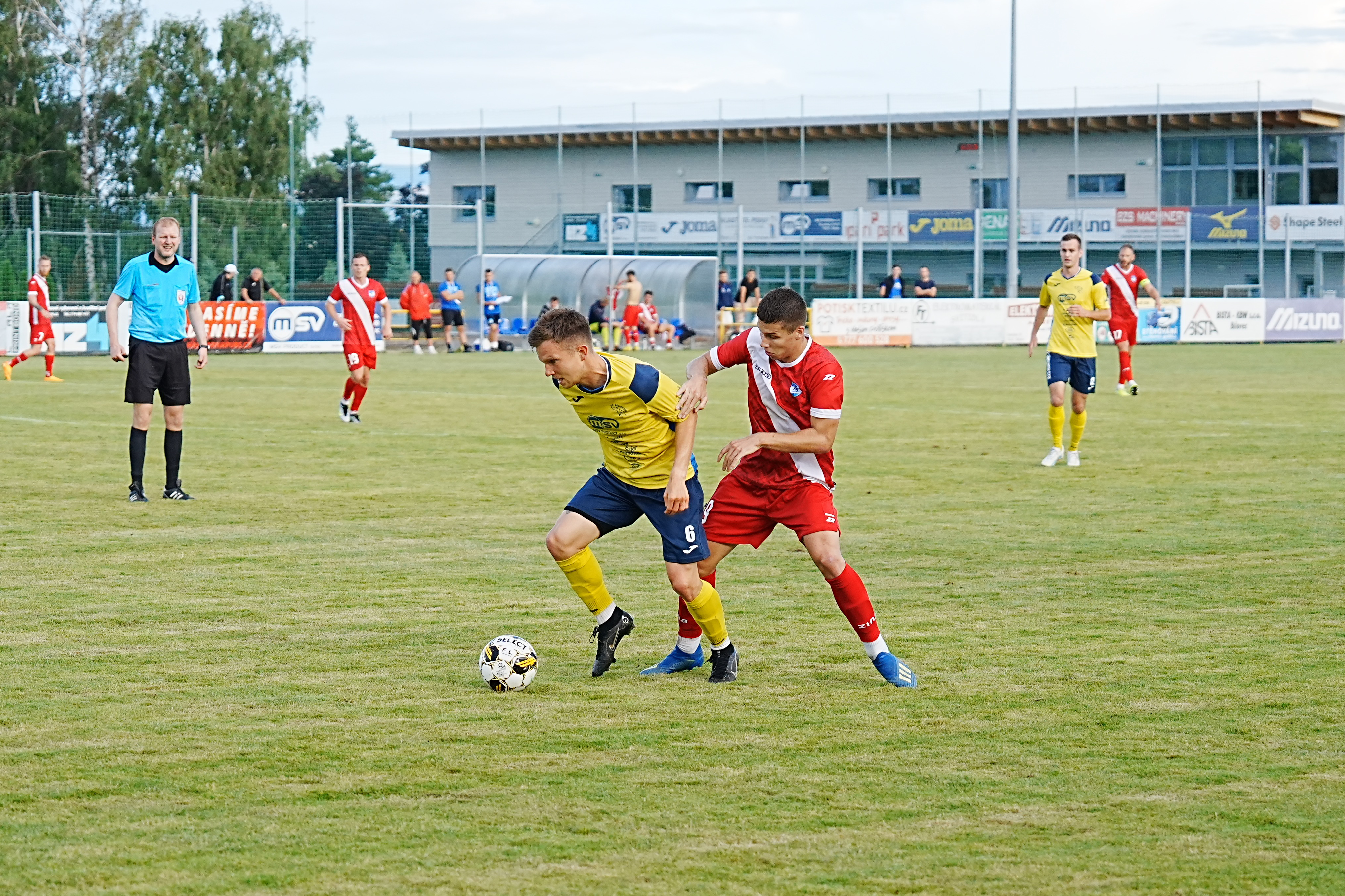 Stejně jako v minulé sezoně, tak i tentokráte, skončila cesta Frýdlantu předkole poháru. Základní sestava frýdlantského celku čítala hned šestici nových hráčů oproti té, na kterou byli fanoušci 1. BFK zvyklí ještě před měsícem. Od úvodních minut se hrál svižný fotbal a první změna skóre přišla po dvaceti minutách hry. To domácí zadák Hrušovský fauloval při pokusu o střelu Kedroně a sudí Vejtasa s nařízením pokutového kopu ani na chvíli nezaváhal. Míč si na bílý puntík postavil Jan Svatonský, který v tomto střetnutí vedl frýdlantský celek jako kapitán, a přesně mířenou ranou k pravé tyči nedal Hatoňovi šanci – 0:1.