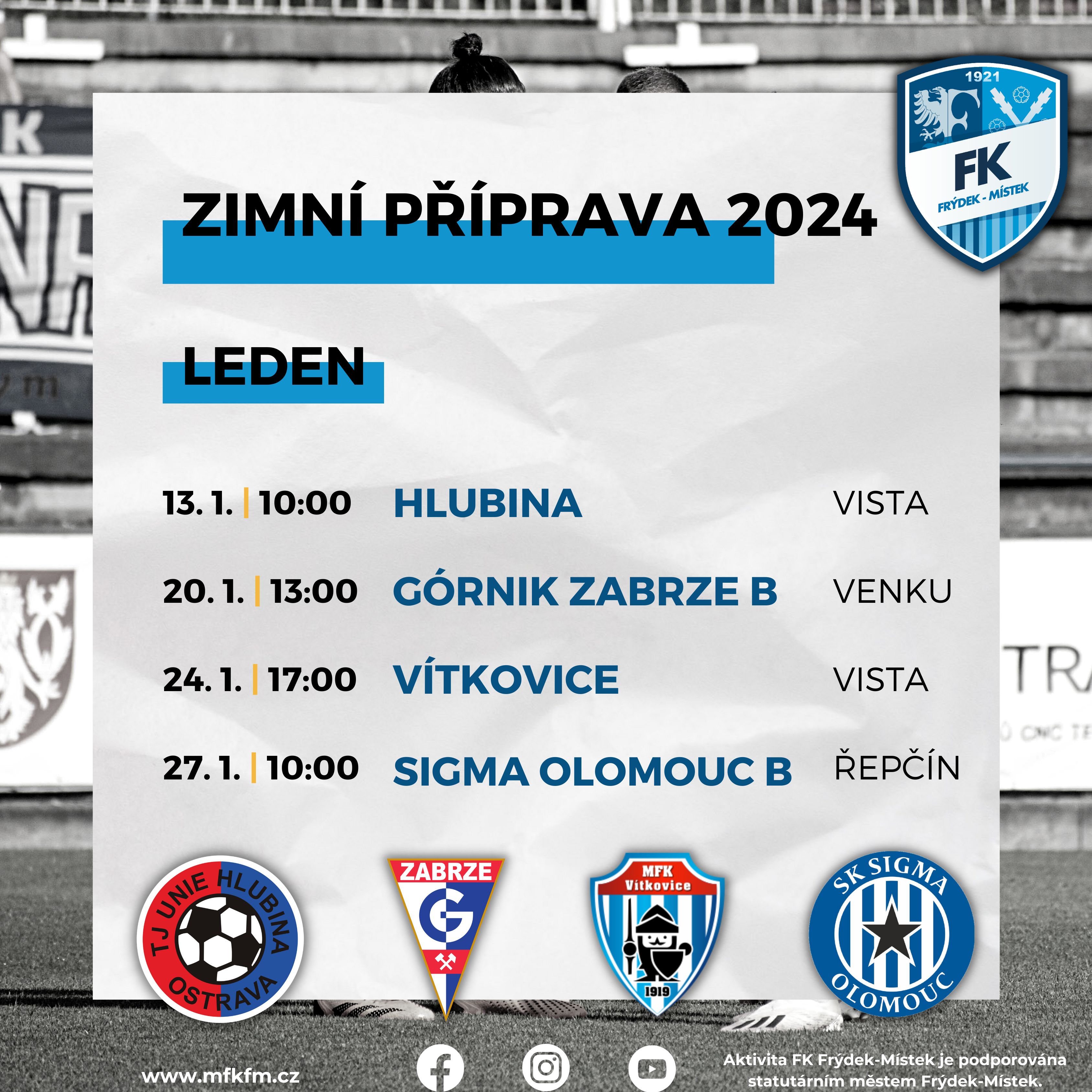 Příští týden 9. ledna začíná A-týmu zimní příprava úvodním tréninkem. Prvním soupeřem bude 13. ledna Hlubina. Hrát se bude v areálu Vista od 10:00. O týden později Lipina zavítá za hranice do polského Zabrze, kde se utká s B-týmem Górniku od 13:00. 24. ledna se Frýdek-Místek představí v tréninkovém centru Vista v Ostravě, a to proti Vítkovicím od 17:00. Posléze 27. ledna čeká Lipinu od 10:00 zápas v Řepčíně proti rezervě Sigmy Olomouc.