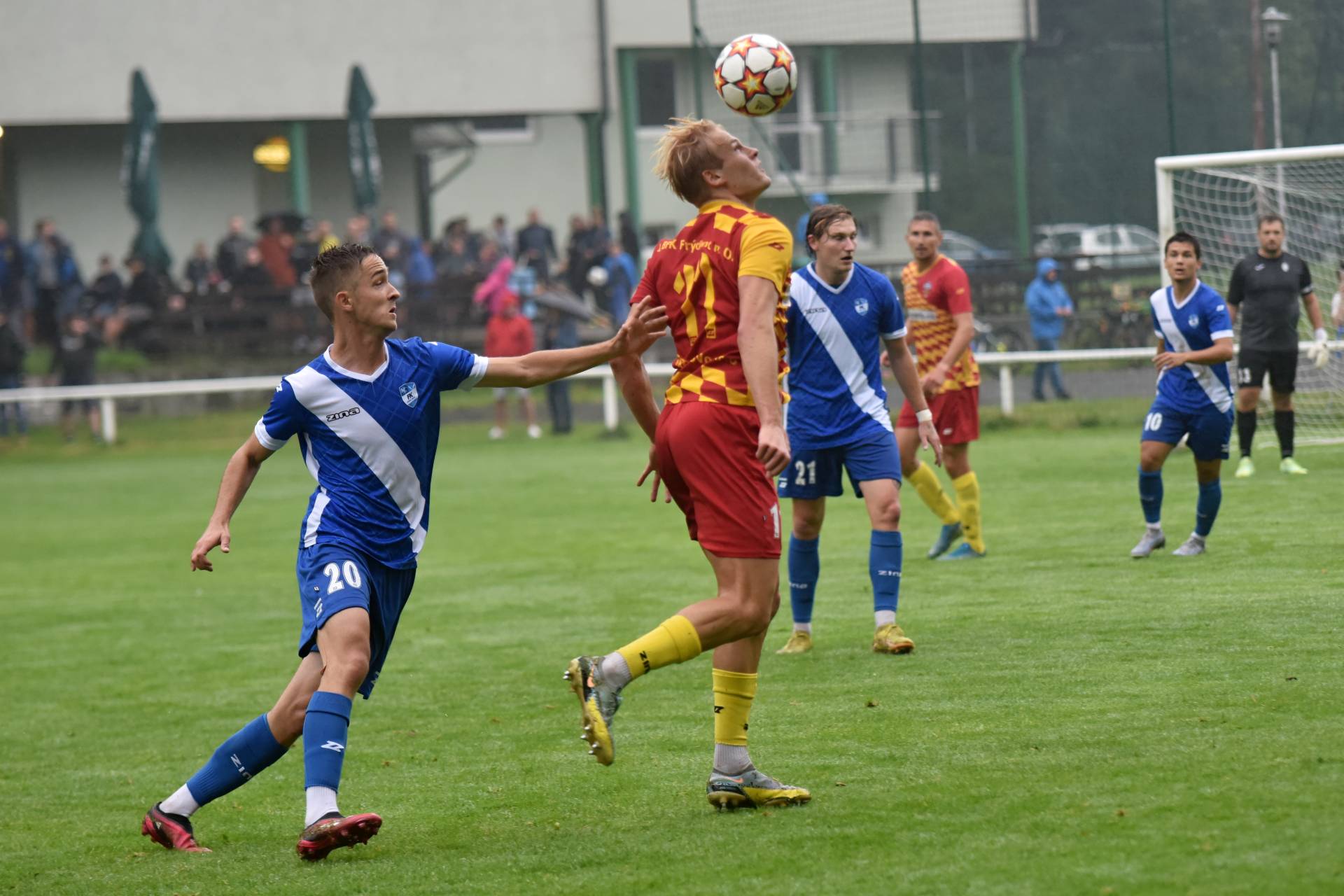 První zápas Lipiny v novém ročníku Moravskoslezské fotbalové ligy nabídl deštivé počasí, ale také plno branek. První půle úvodního kola MSFL byla z obou stran velice svižná, hráči si na promoklém trávníku nedarovali ani metr prostoru. Zkrátka, divákovi, který na derby v sobotním odpoledni zavítal, se musel fotbal líbit. K prvnímu vzruchu došlo v 11. minutě, kdy sudí Proske ponechal po faulu na Byrtuse výhodu a ránu Hladíka hostující gólman Lasák vyrazil. Podobně skončil na druhé straně střelecký pokus Janjuše, to běžela 29. minuta. O čtyři minuty později se už skóre utkání přeci jen změnilo. Byrtus zahrával z pravé strany standardní situaci a Sebastian Pejša v pádu poprvé rozjásal frýdlantské fanoušky – 1:0.