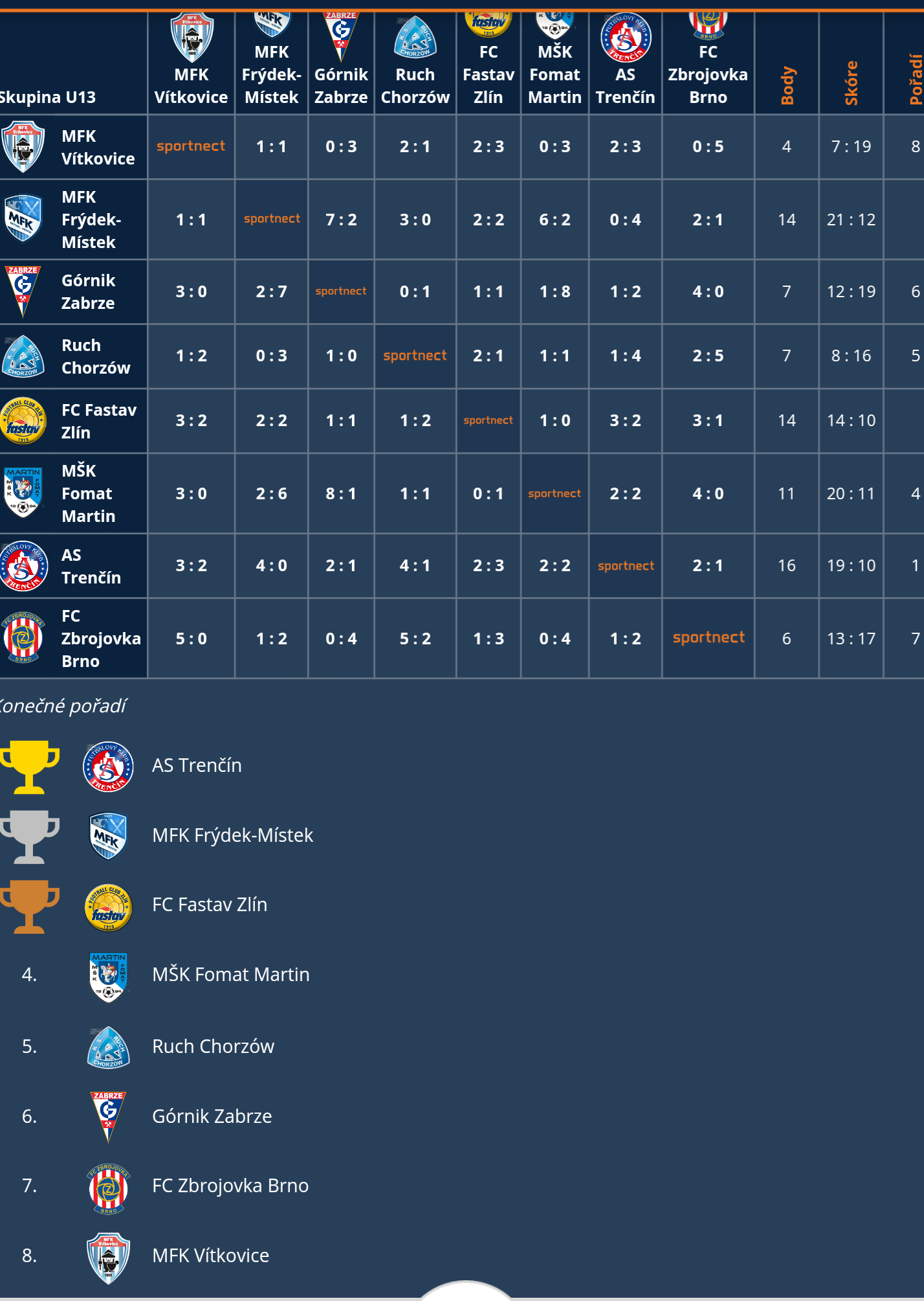 Konečné pořadí: 1. AS Trenčín, 2. MFK Frýdek-Místek, 3. FC FASTAV Zlín, 4. MŠK Fomat Martin, 5. Ruch Chorzów, 6. Górnik Zabrze, 7. FC Zbrojovka Brno, 8. MFK Vítkovice.