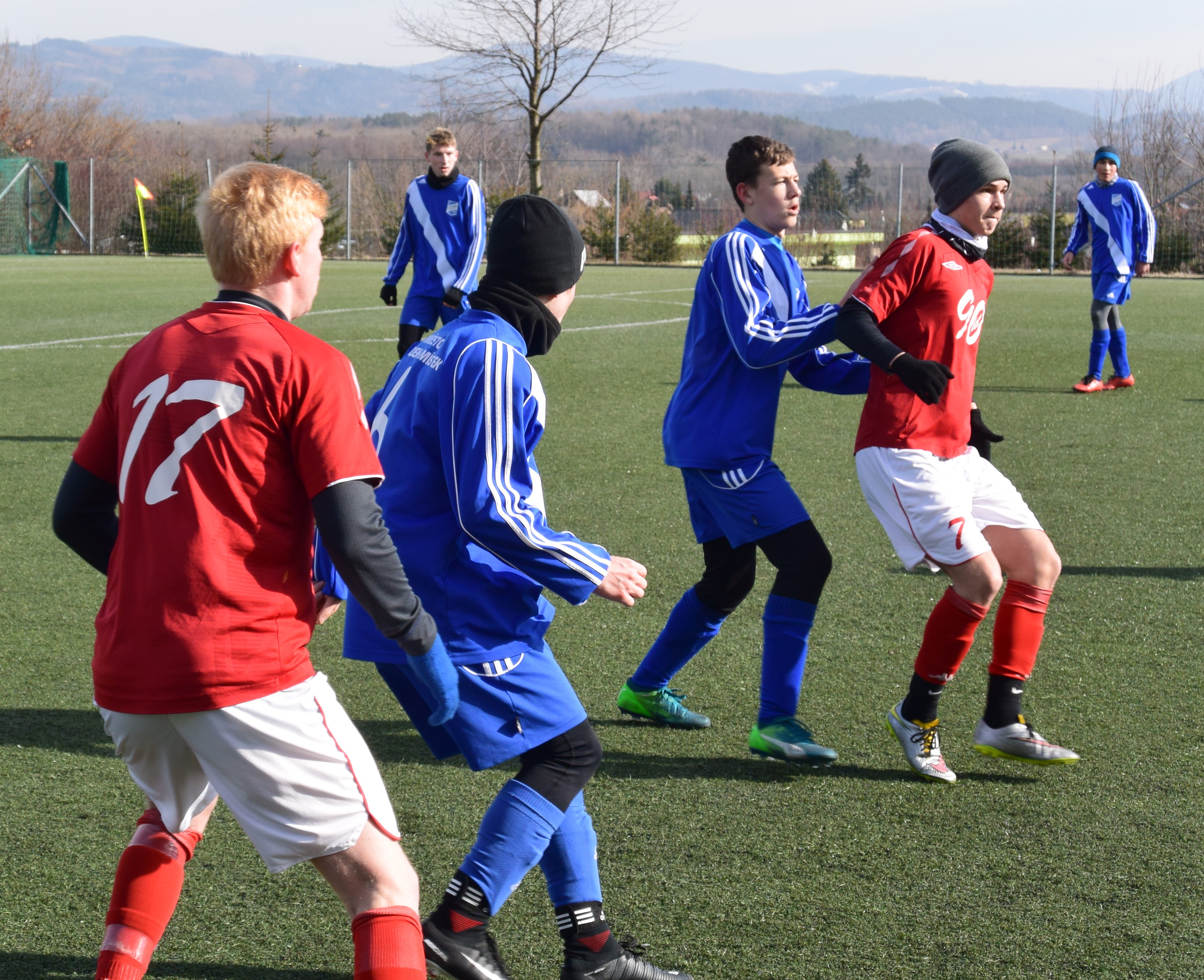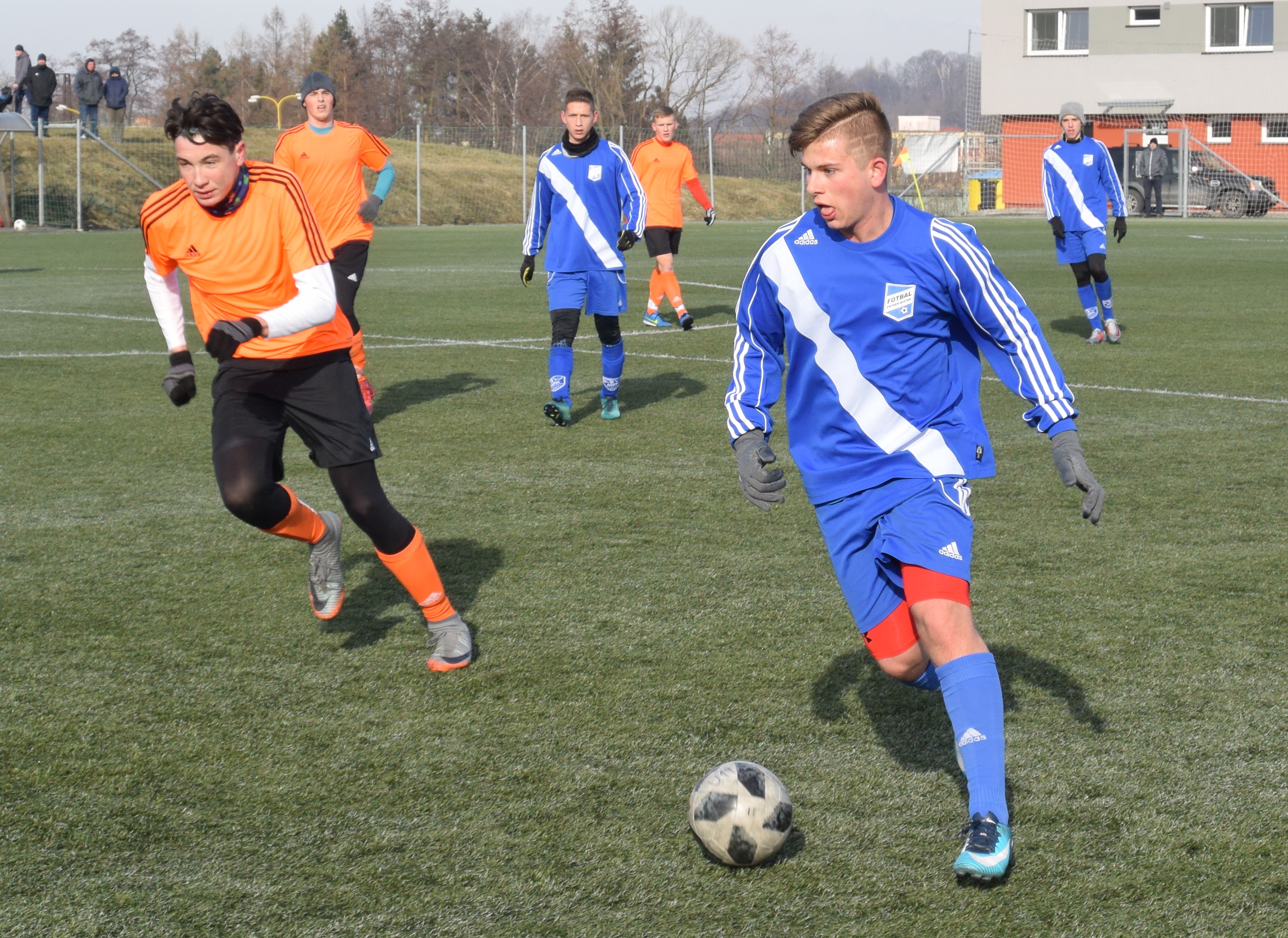 Stejně jako U18, se museli Valcíři vypořádat s těžkým terénem, a jako již celý půlrok v mistrovské soutěži i z fyzickou a výškovou převahou staršího soupeře. Bohužel také stále vinou absencí a zranění s úzkým kádrem. Svěřenci trenéra Rašky se však se situací poprali solidně. Ostatně do velkých šancích se v první půli dostávali jen oni. Dvakrát se propracoval do dobré příležitosti Sebastian Šeba. Nicméně, skóre se ani v jednom z případů neměnilo. Dobrou možnost měl i hlavičkující Králík.