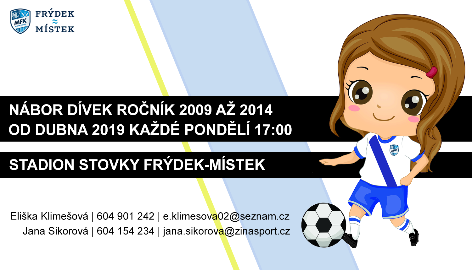 Pokud chcete vaši ratolest přihlásit nebo si jen vyzkoušet, zda by ji, není nic jednoduššího. Tréninky probíhají každé pondělí od 17:00 na hlavním hřišti fotbalového stadionu ve Stovkách ve Frýdku-Místku. Nábor se týká dívek ročníku 2009 - 2014.