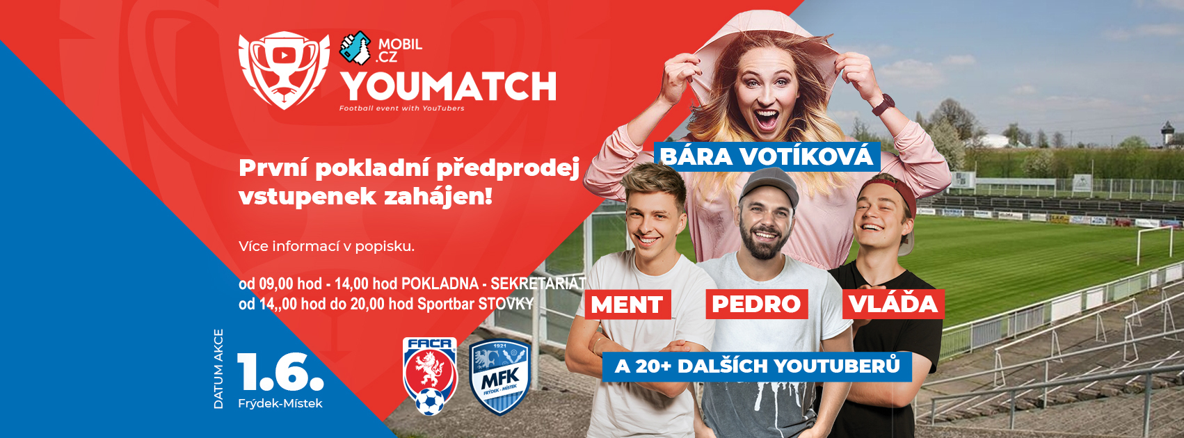Stadion Stovky se stane na den dětí, 1. června, centrem zábavy, hudby a především fotbalu. První oficiální Mistrovství českých a slovenských Youtuberů aneb Youmatch.cz - "Dokážeme se bavit jinak, než jen u počítače" bude mít bohatý doprovodný program. Spolu se zábavou je smyslem akce podpořit zájem dětí a mládeže o fotbal, vše prostřednictvím známých osobností, hlavně ze světa sociálních sítí a dále hudebních celebrit a osobností z kopané. Na české straně najdeme například brankářku České fotbalové reprezentace a populární Youtuberku Báru Votíkovou. Svůj koncert bude mít v rámci programu kapela Robin Mood a Sebastian. Je určitě, na co se těšit!